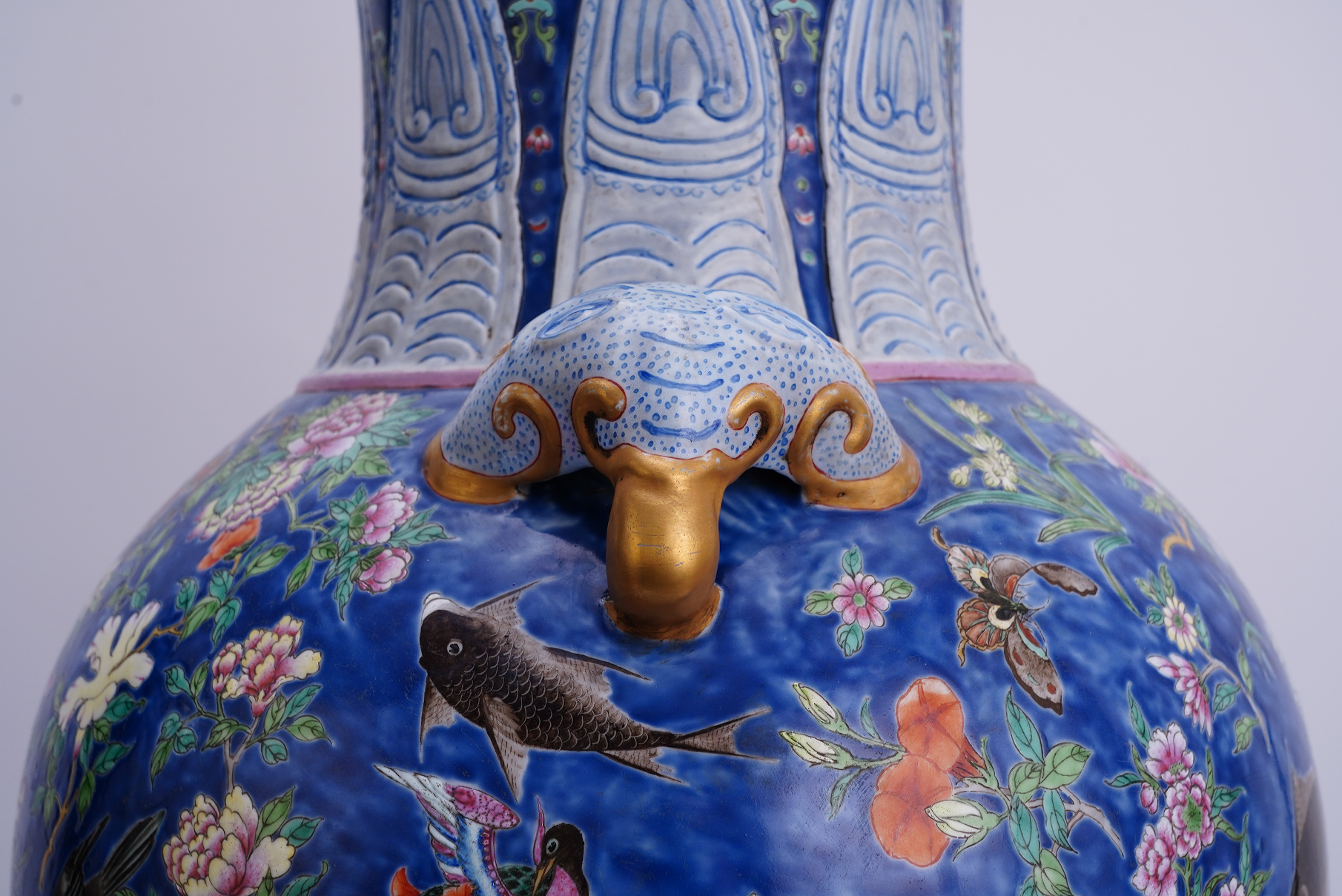 此尊通體以藍釉為地,口沿繪折枝花卉紋。頸部繪變形蕉葉紋。肩飾雙象耳,以金彩點綴,尤顯富麗堂皇。腹部通景繪粉彩百花獻瑞圖、玉蘭高潔,菊花嬌艷,牡丹雍容,花團錦簇,枝葉婉轉,隙地飾鳳凰、蝴蝶、鯉魚、喜鵲等,姿態各異,靈動傳神。整器紋飾繁而不縟,繪畫精湛細膩,施彩明艷動人,于籃釉映襯下尤顯麗致非凡。
