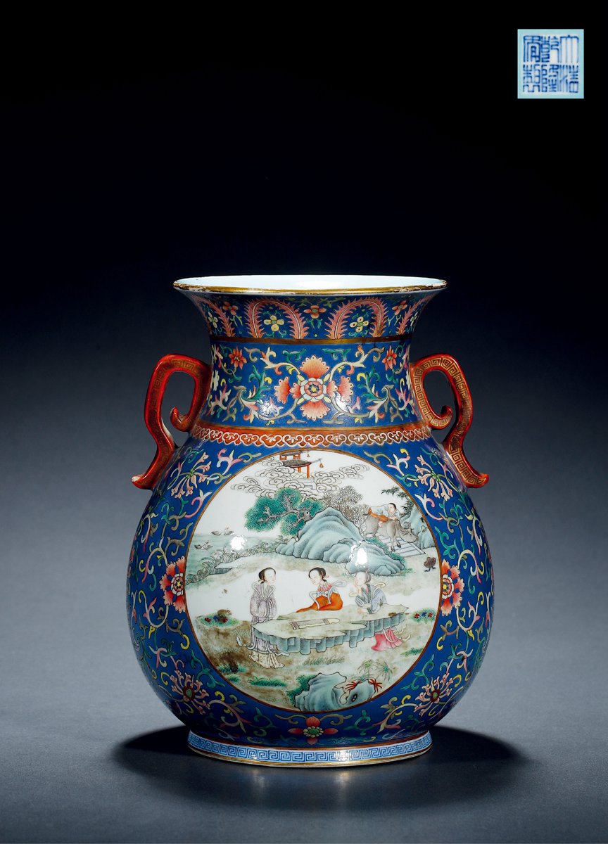 色彩搭配和諧:藍地與粉彩色彩對比鮮明又和諧統一。藍色沉穩大氣,為粉彩圖案提供鮮明襯托,使圖案更加絢麗奪目,體現乾隆瓷器裝飾追求華麗、富貴的風格 。